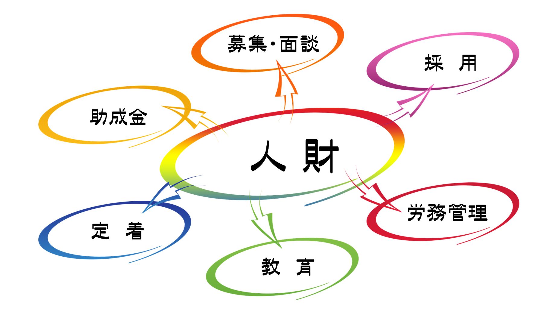 「人財募集⇒面接⇒採用⇒労務管理⇒教育⇒定着⇒助成金」の